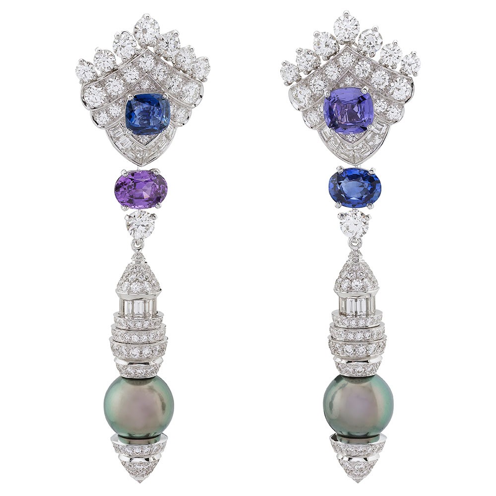 Paire de pendants d’oreilles « Château enchanté » (L’enfance) en or blanc, diamants, perles de Tahiti et saphirs de couleurs. Photo : VCA