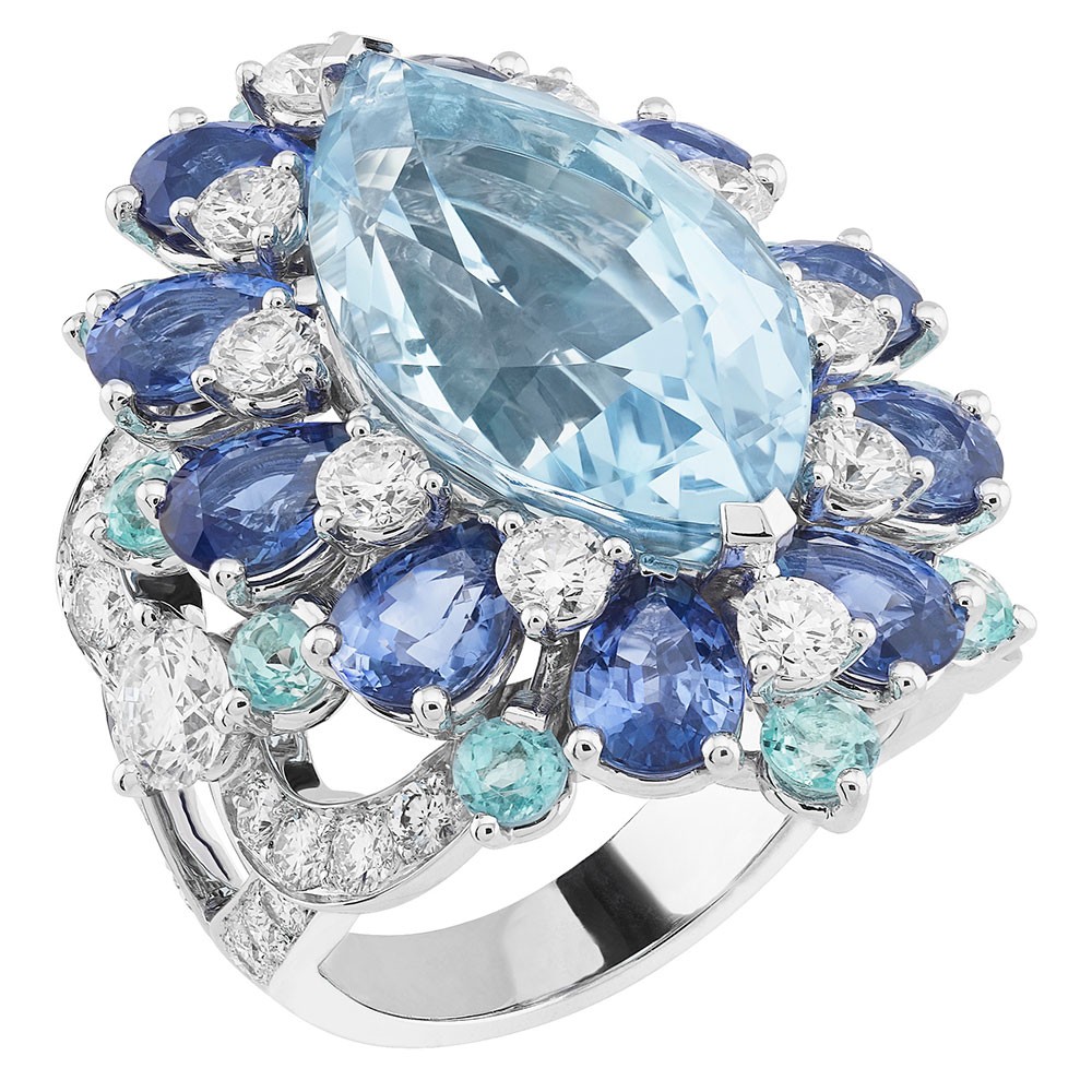 Bague « Robe couleur du temps » (L’enfance) réalisée en or blanc, diamants, tourmalines et aigues-marines dont la pierre centrale, une marquise de 9,88 carats. Photo : VCA