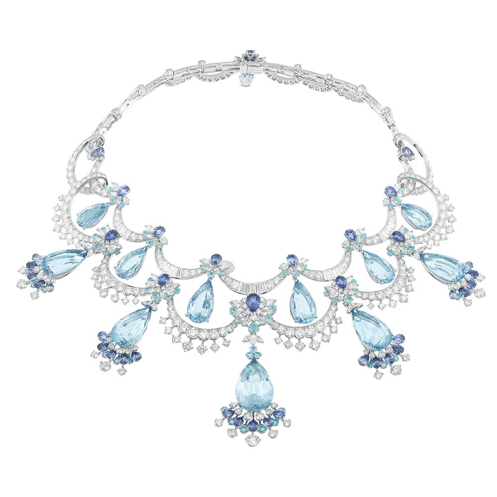 Collier « Robe couleur du temps » (L’enfance) réalisé en or blanc, diamants, tourmalines, saphirs et aigues-marines dont 12 poires pour un total de 129,87 carats. Photo : VCA