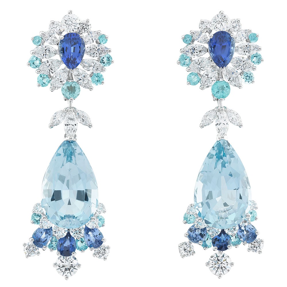 Paire de pendants d’oreilles « Robe couleur du temps » réalisée en or blanc, diamants, tourmalines, saphirs et aigues-marines. Les centres, deux poires parfaitement appairées, totalisent un poids de 24,13 carats. Photo : VCA