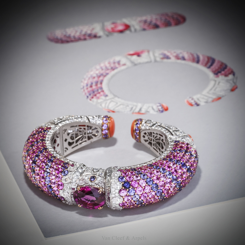 Bracelet « Protection féérique » réalisé en or blanc et rose. Il est serti de diamants, cabochons de corail et de saphirs de couleurs. Le centre de la pièce est un saphir rose du Sri Lanka de 13,52 carats. Photo : VCA