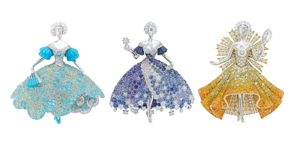 Les broches « Robe couleur du temps », « Robe couleur de la lune » et « Robe couleur du soleil » (La forêt). Ils sont réalisés en or blanc et or jaune, diamants, tourmalines, turquoises, saphirs de couleurs. Photo : VCA