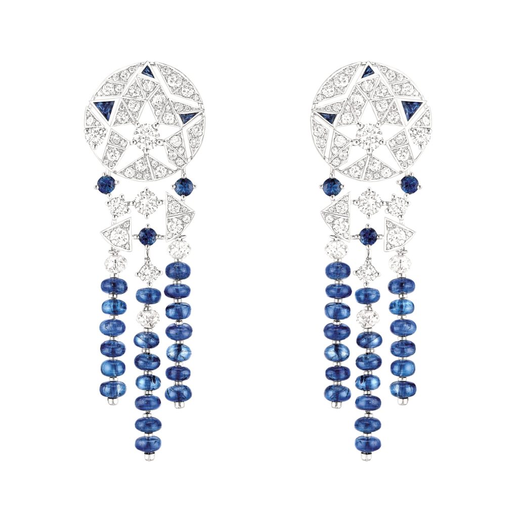 Muse earrings in white gold, set with 40 sapphire balls for a total weight of 23.6 carats, 6 brilliant-cut sapphires, 6 fancy-cut sapphires, 6 diamond balls for a total weight of 2 carats and 118 brilliant-cut diamonds for a total weight of 3.3 carats. Photo : Chanel Joaillerie