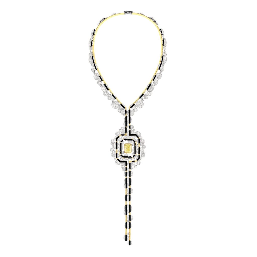 Morning in Vendôme necklace in white and yellow gold, set with a 12-carat emerald-cut yellow diamond, 2160 brilliant-cut diamonds for a total weight of 31.6 carats, 339 brilliant-cut yellow diamonds for a total weight of 4.4 carats and sculpted onyx. Photo: Chanel Joaillerie
