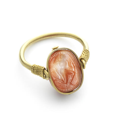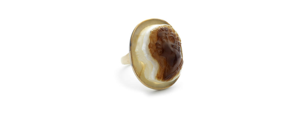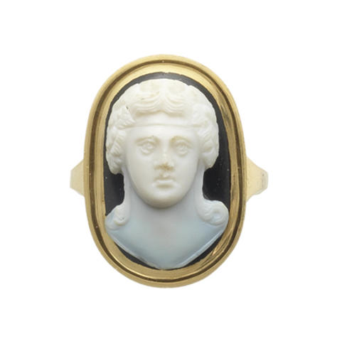 A yellow gold ring set with an agate cameo representing a female figure, probably of Roman origin and cut between the 1st and 2nd centuries A.D. Estimated at between €1900 and €2500. Photo: Bonhams.