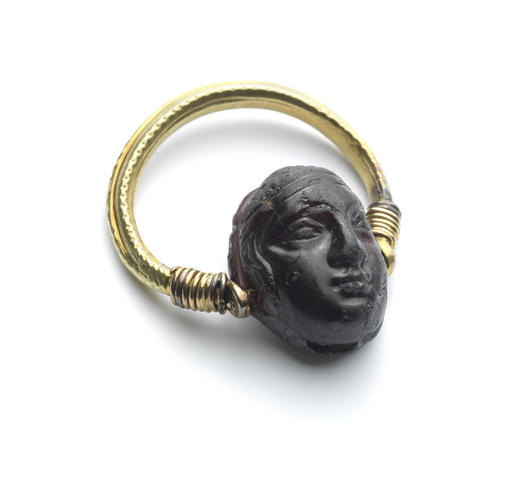 A remarkable yellow gold ring set with a garnet cameo of Greek origin. The cameo dates from the 4th century BC. Estimate between 3800 and 6300 €. Photo : Bonhams