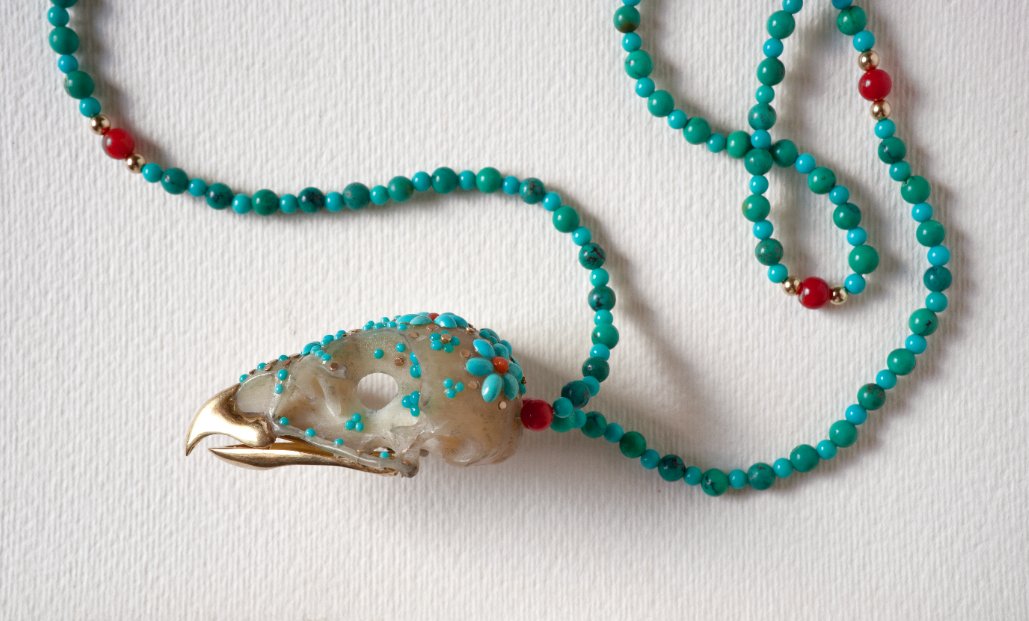 “Eagle Skull Haeliaeetus Leucocephalus. Horn, coral, turquoise and gold. Photo: Harumi Klossowska of Rola