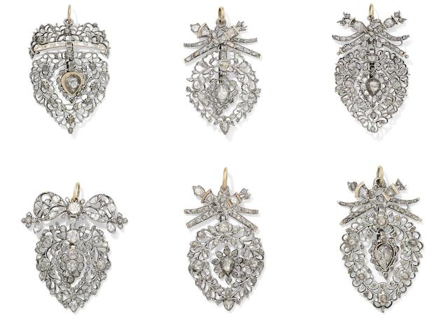 Lot 69: A rare collection of silver, gold and diamond “heart” brooches. These 18th and 19th century Belgian pieces were typical of the city of Antwerp. They are known as Flemish Hearts(Vlaams Hart) and were offered for Mother’s Day. Variants can be found in the north of France, particularly in Normandy, but also throughout Holland. Estimate between 4600 and 7000 €. Photo: Bonhams