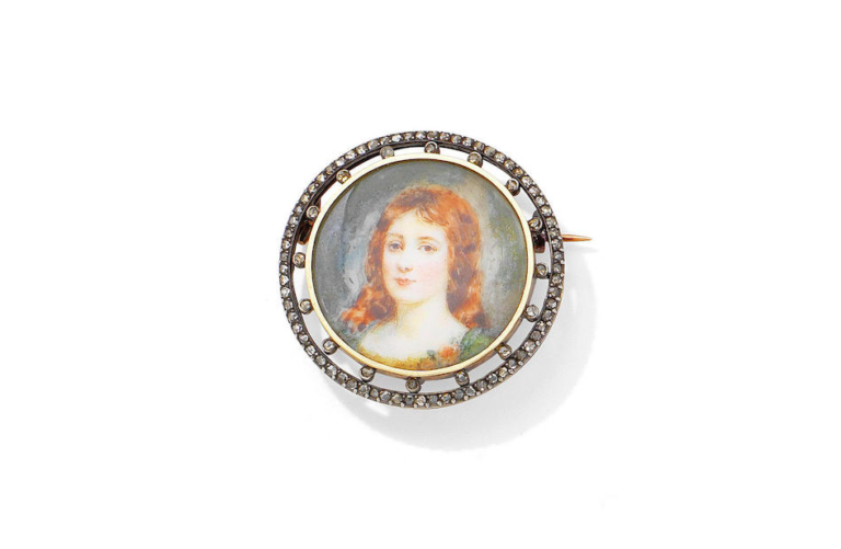 Lot 8: Rare gold and silver brooch by Frédéric Boucheron, diamonds and painted ivory miniature attributed to Fernand Paillet who was a close collaborator of Boucheron. Late 19th century, signed. Estimated at between €2300 and €3500. Photo: Bonhams