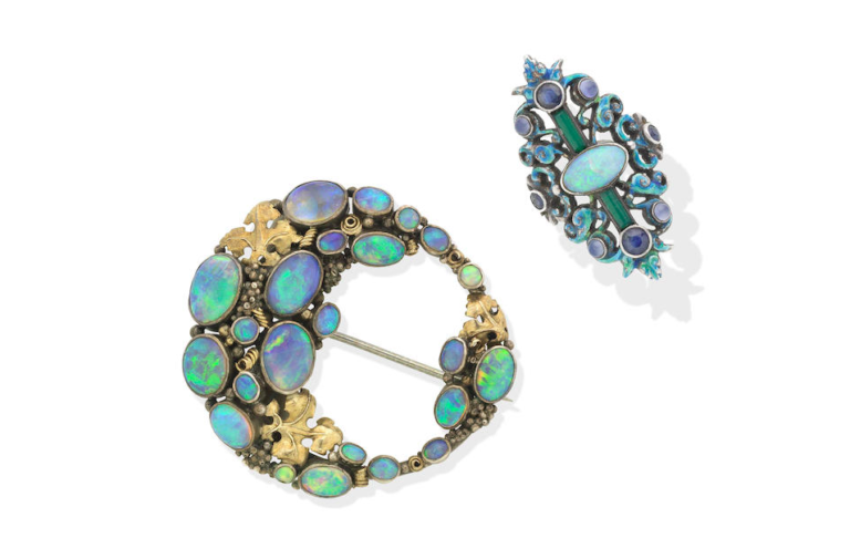 Lot 338: An enamelled brooch and ring set with various gemstones and opals. The former is attributed to Sybil Dunlop and the latter to Dorrie Nossiter. Both are famous representatives of the Arts & Crafts movement. Sybil (1889-1968) was born of Scottish parents and trained in Brussels where she discovered jewellery. On her return to England, she set up her own workshop in Kensington Church Street, London, in the early 1920s and was soon joined by W. Nathanson. The company produced pieces inspired by Celtic motifs and nature. Nathanson became known for making rich, geometric settings using dyed quartz. They closed in 1939 because of the war and Sybil never returned to the workshop because of her health. Nathan continued until 1971. Dorrie Nossiter (1893-1977) studied at the Birmingham School of Art. Her work is inspired by nature and is perfectly in line with this artistic movement of which she is one of the great representatives. A contemporary of Dunlop, their work is sometimes confused despite Nossiter’s predilection for asymmetrical motifs. Estimated at €1,200 to €1,700. Photo: Bonhams