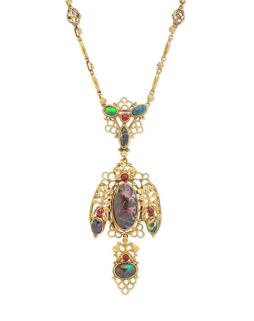 Lot 340: A rare Arts & Crafts necklace by John Houghton Maurice Bonnor, circa 1905-1908. Gold, opals and rubies. An unsigned drawing of this necklace is held in the archives of the English Guild of Craftsmen Jewellers, now part of the Goldsmiths’ Company, the equivalent of our HBJO. This sketch shows the addition of the rubies to the first design and shows that the individual stones belonged to the client at the time. English jeweller John Houghton Maurice Bonnor (1875-1917) was first an architect before meeting and being trained by Henry Wilson at the Central School of Arts and Crafts. From 1908 onwards, he started his own workshop with his wife Nancy Agar and left the Guild’s workshop, which he had headed since 1905. Estimate between 2900 and 4100 €.