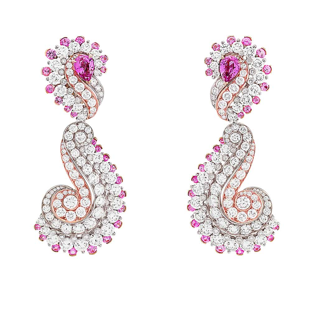 Amour retrouvé” earrings in white gold, pink gold, diamonds and pink sapphires. Transformable ear motifs. The ear motifs can be worn alone, while the detachable pendants are attached to an elegant clip-on base. Photo : Van Cleef & Arpels