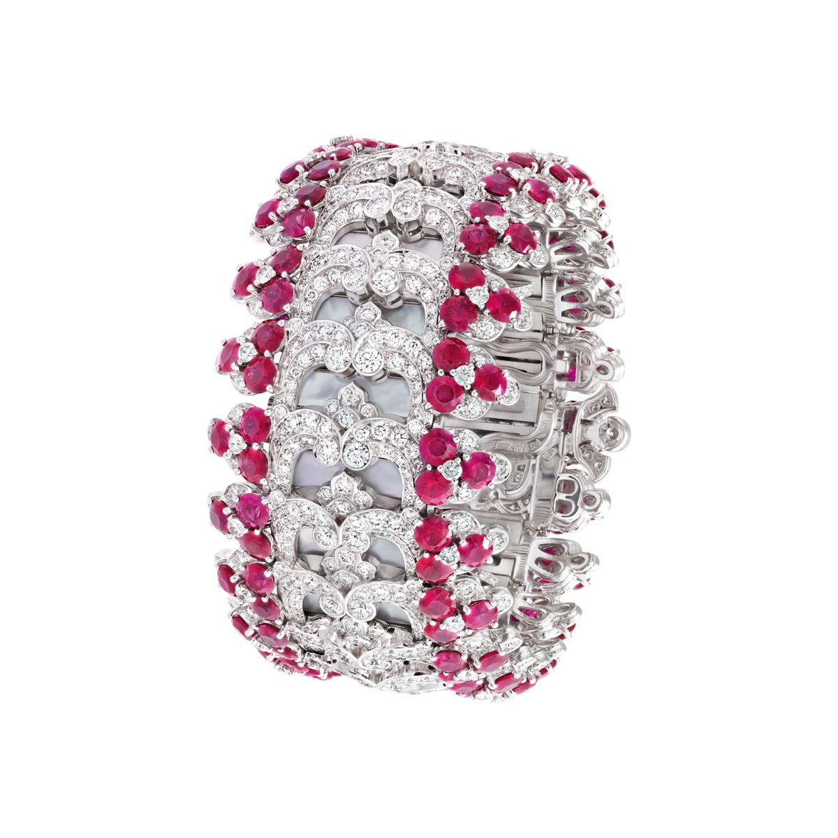 Bracelet “Dentelle secrète” in white gold, diamonds, rubies, onyx, white mother of pearl. Visible in the open parts, the underlying onyx can be replaced by white mother-of-pearl thanks to an ingenious sliding system. The materials thus alternate as desired, from shiny black to iridescent white. Photo: Van Cleef & Arpels