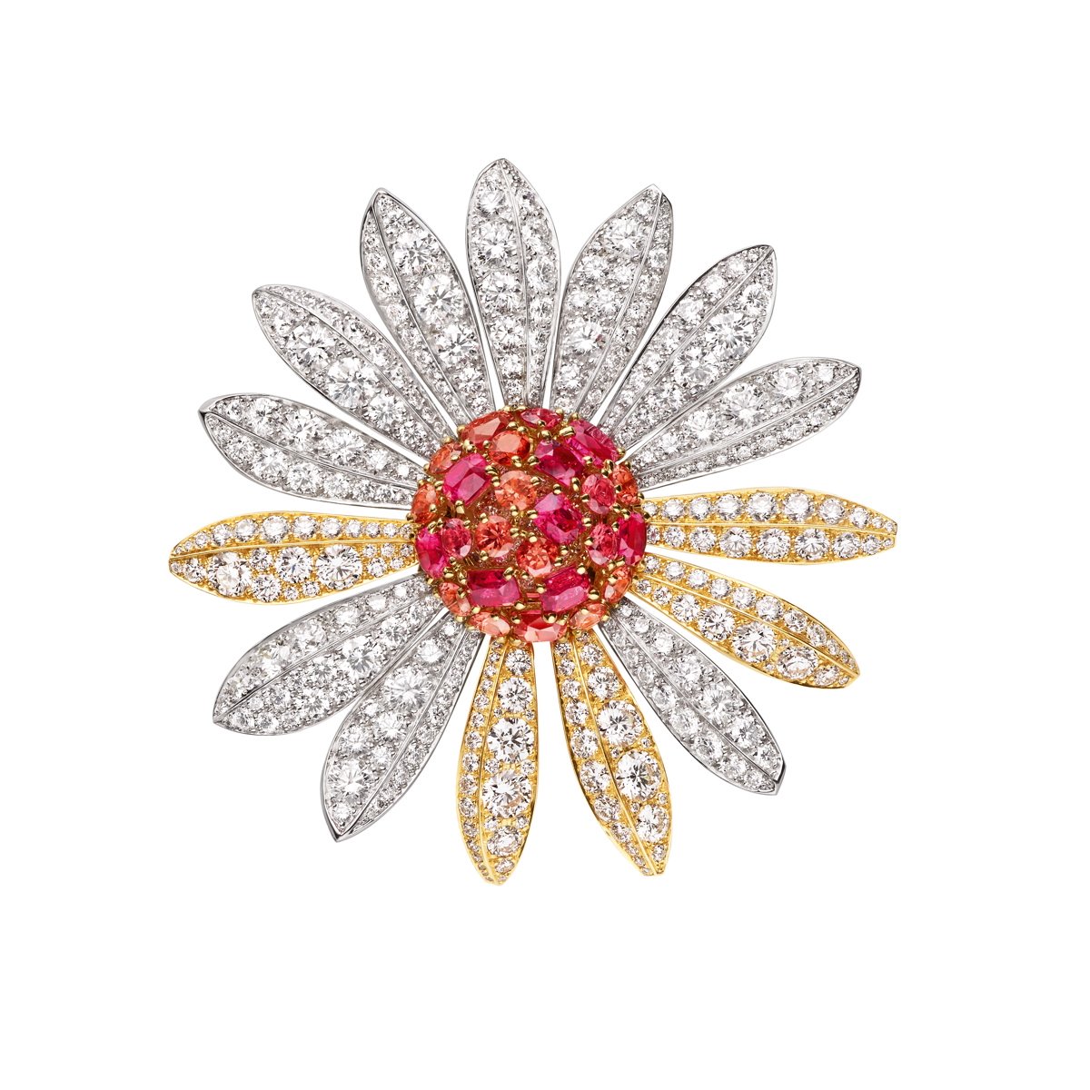 Marguerite d’amour” clip in yellow gold, white gold, diamonds, orange spinels and roses. Some of the petals have an invisible mechanism that allows them to be gently turned over before reading the engraved messages “Tendrement”, “Passionnément”, “Éternellement”, “Infiniment” and “A la folie”. Photo: Van Cleef & Arpels