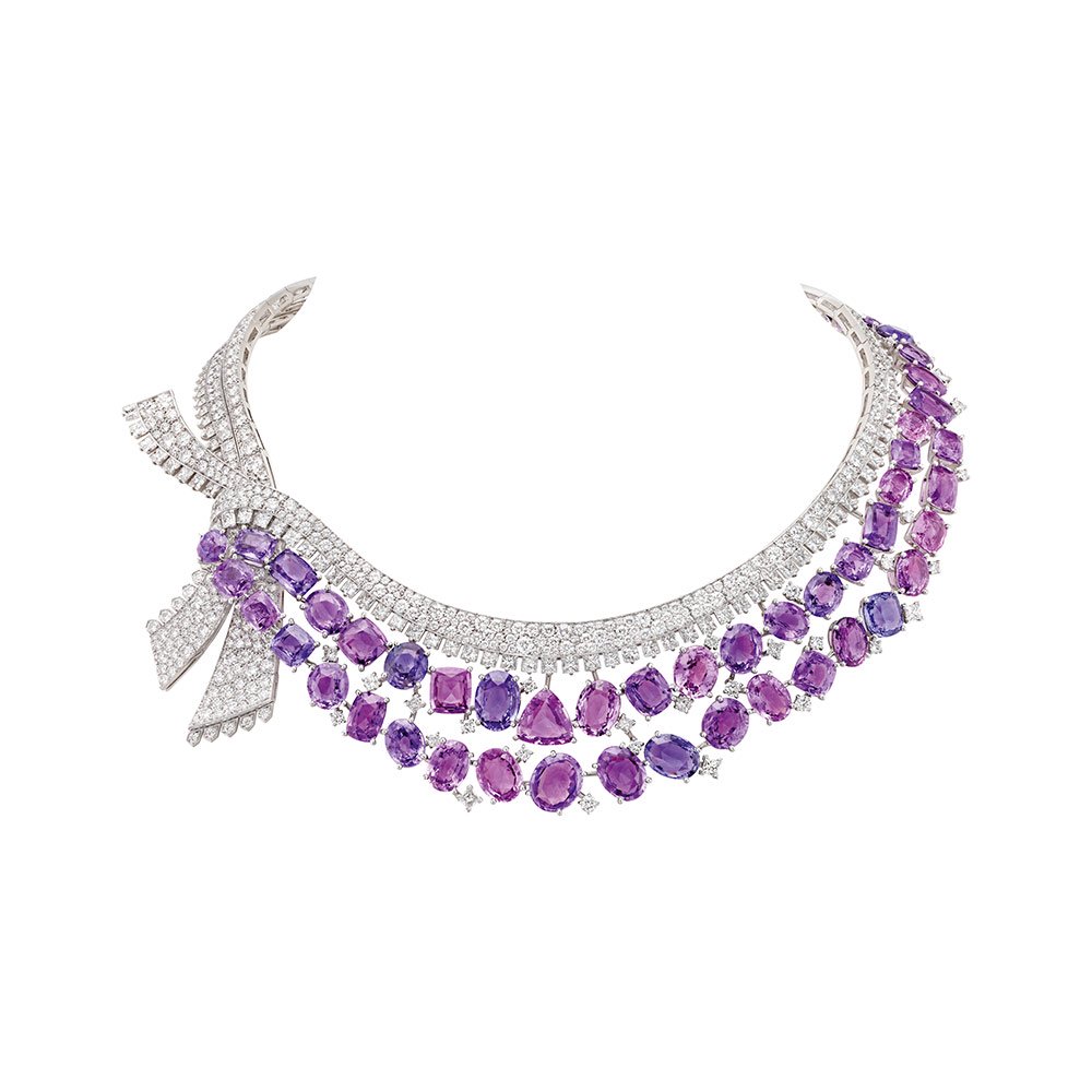 Necklace “Message des hirondelles” in white gold, pink gold, diamonds, coloured sapphires, coral, red enamel, 52 fancy cut purple sapphires for a total of 142,10 carats (Madagascar). The surprise comes from its jewellery clasp, a case for a secret. On either side of a knotted ribbon, two graceful swallows move aside to reveal a pink gold envelope, sealed with a red enamel heart. Photo: Van Cleef & Arpels