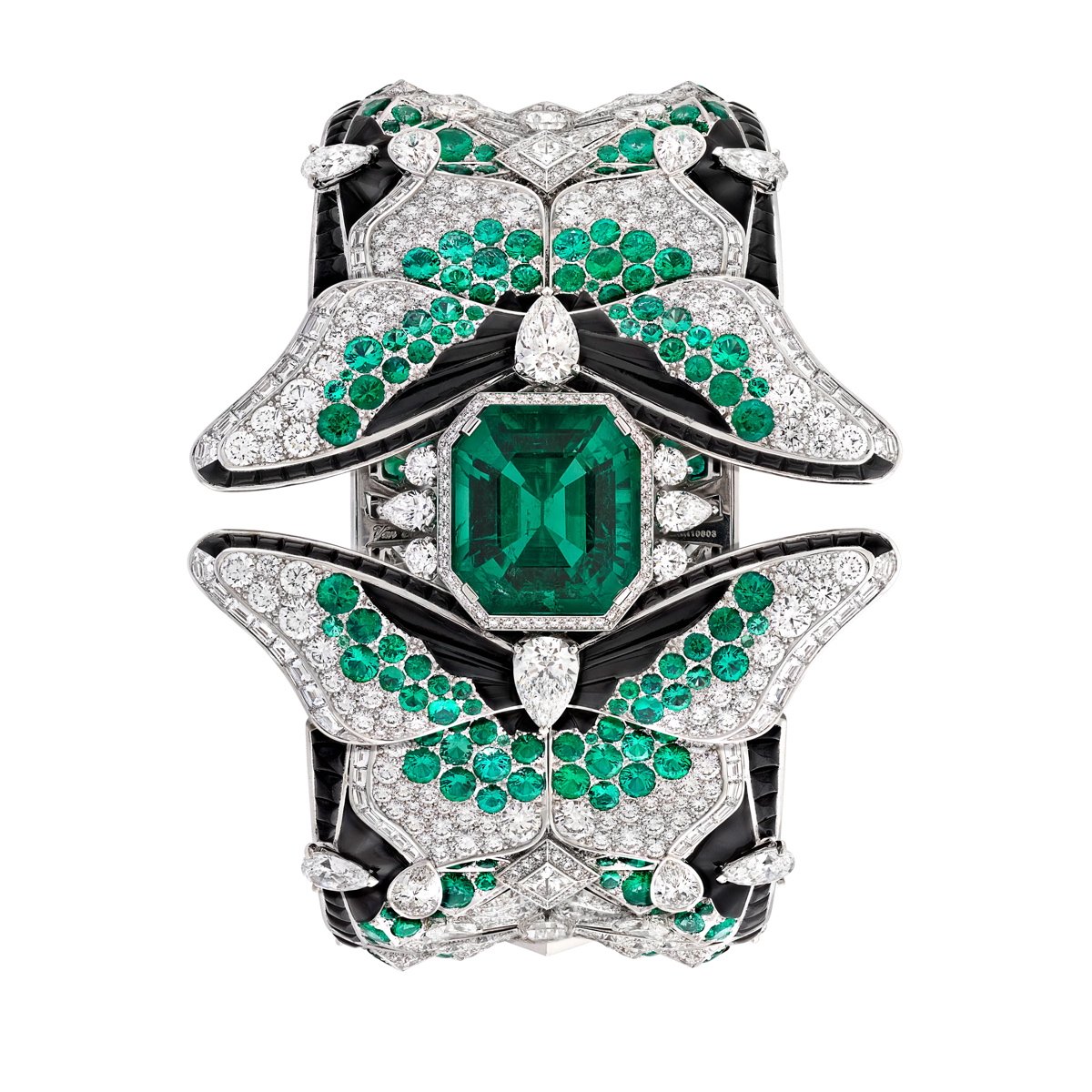 Secret Butterfly” watch in white gold, diamonds, emeralds, black spinels, onyx, white mother-of-pearl, one 14.57 carat emerald cut emerald (Colombia), mechanical hand-wound movement. One of the butterflies hides a mother-of-pearl dial under its lower wings, revealed with the fingertips. Photo: Van Cleef & Arpels