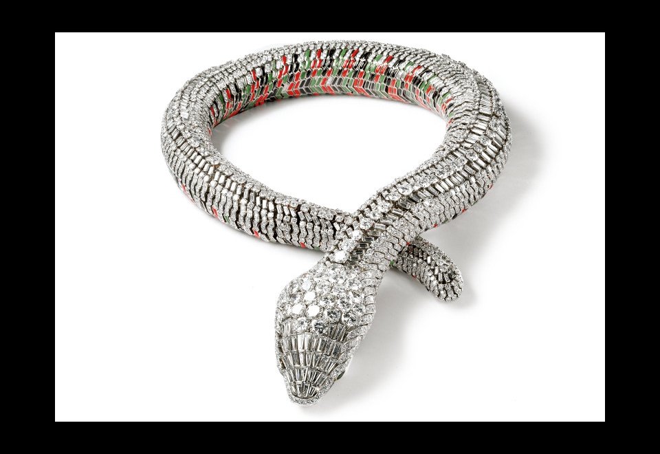 Serpent necklace, Cartier Paris, commissioned in 1968, platinum, white and yellow gold, 2,473 brilliant-cut and baguette-cut diamonds for a total weight of 178.21 carats, two pear-shaped emeralds (eyes), green, red and black enamel. Cartier collection. Photo: Nick Welsh, Cartier Collection © Cartier