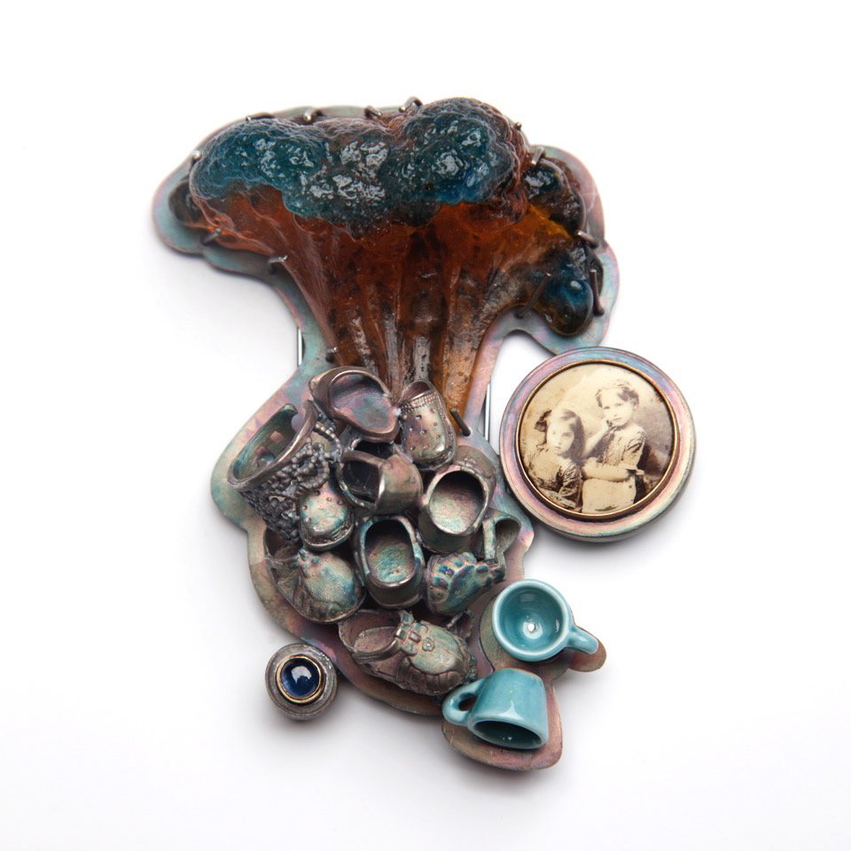 Serenade brooch by Lisa and Scott Cylinder in silver, bronze, nickel silver, amaranth, paint, celluloid and antique saxophone key, 2017. Photo: La Joaillerie by Mazlo