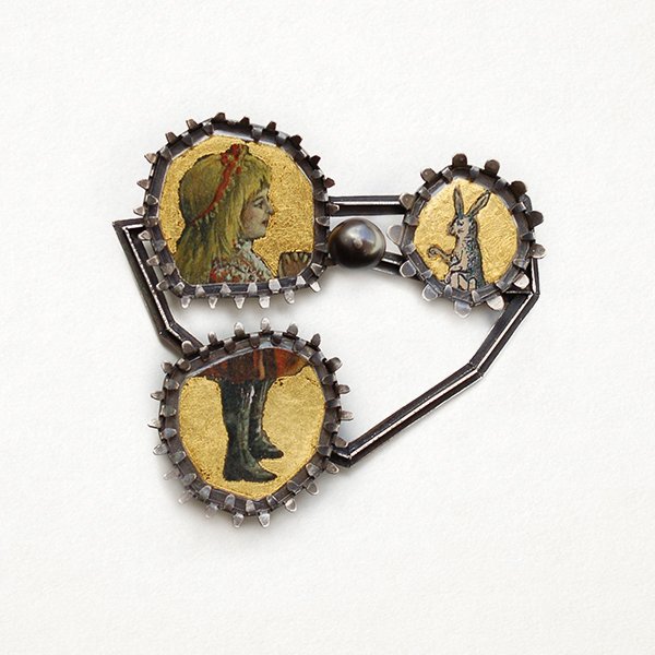 “EINE UNAUFMERSAME SCHULERIN”, Brooch, 2012. Love is Love series. Silver, paper in laminated plastic, gold leaf, beads. Photo: Jana Machatova for Galerie La Joaillerie par Mazlo
