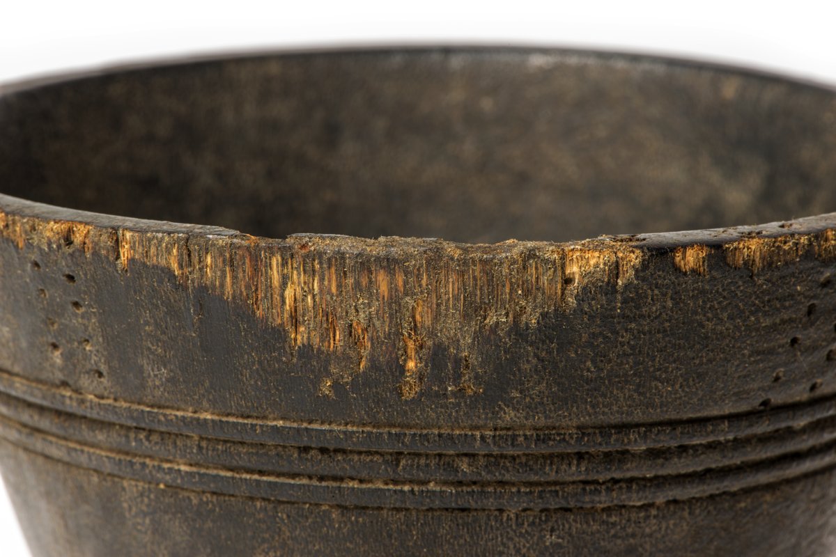 The lid of the case shows traces of abrasion that coincide with the same damage as that observed on the upper part of the bowl (Fig. 2 and Fig. 5). Careful examination of these marks showed that they were clear evidence of wood-boring or scavenging insect attacks. Considering the position of the damage, the attack obviously occurred when the cup was in its case. The insects did extensive damage to the leather and, fortunately, to a lesser extent to the cup.