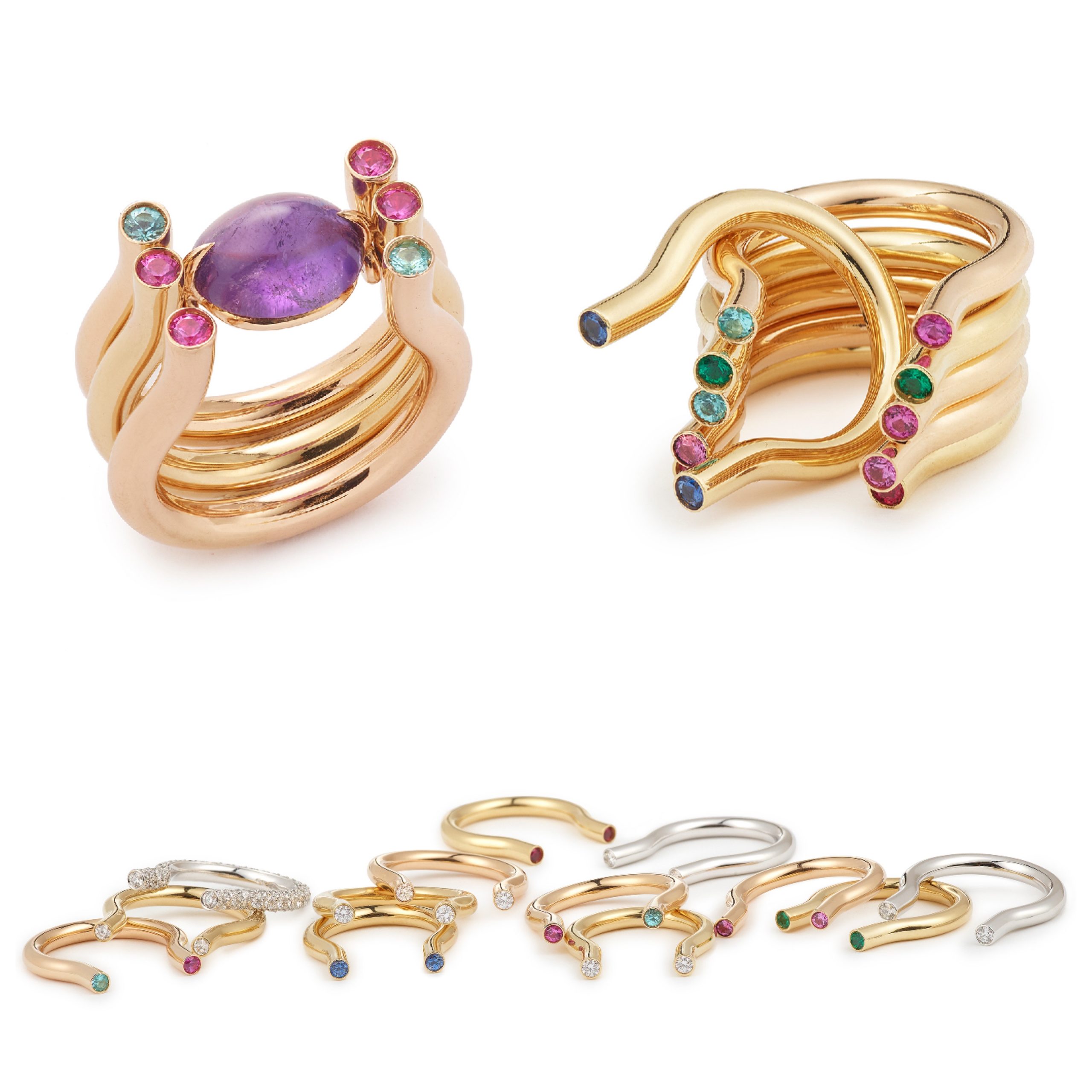 Single collection, in yellow gold, white gold, diamonds, sapphires, tourmalines, garnets, with a more substantial centre (here an amethyst). Mix and match. Photo: DiamondHolic / Gwenaelle de Contades