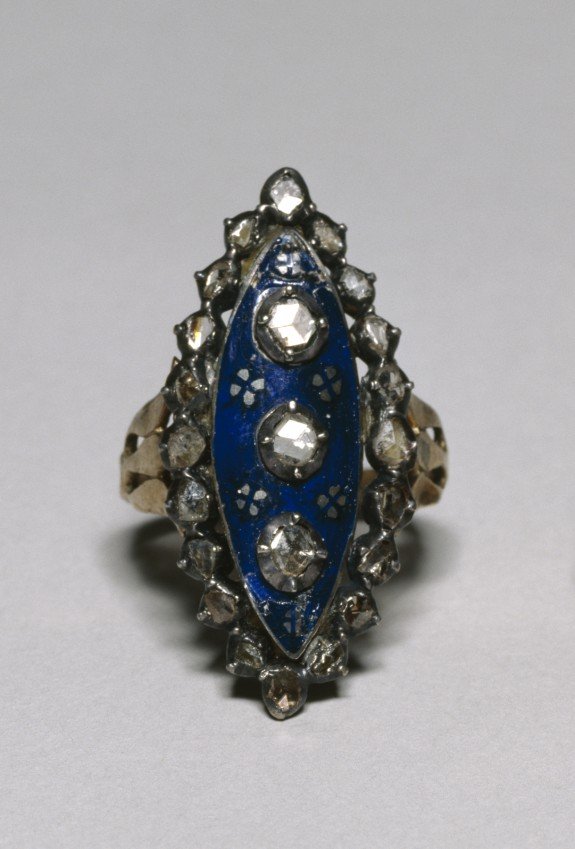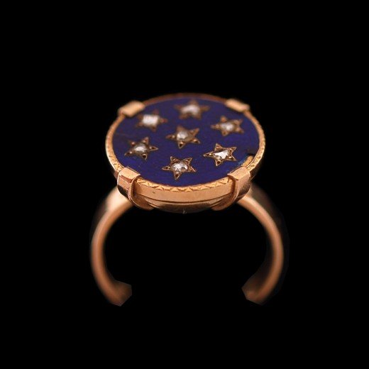 Some of these rings are set with a central stone in the middle of the starry sky, like a star that shines brighter than the others. This is known as a childbirth ring. It is also worth noting that some of these pieces were mounted on glass or lapis lazuli and not on enamel.