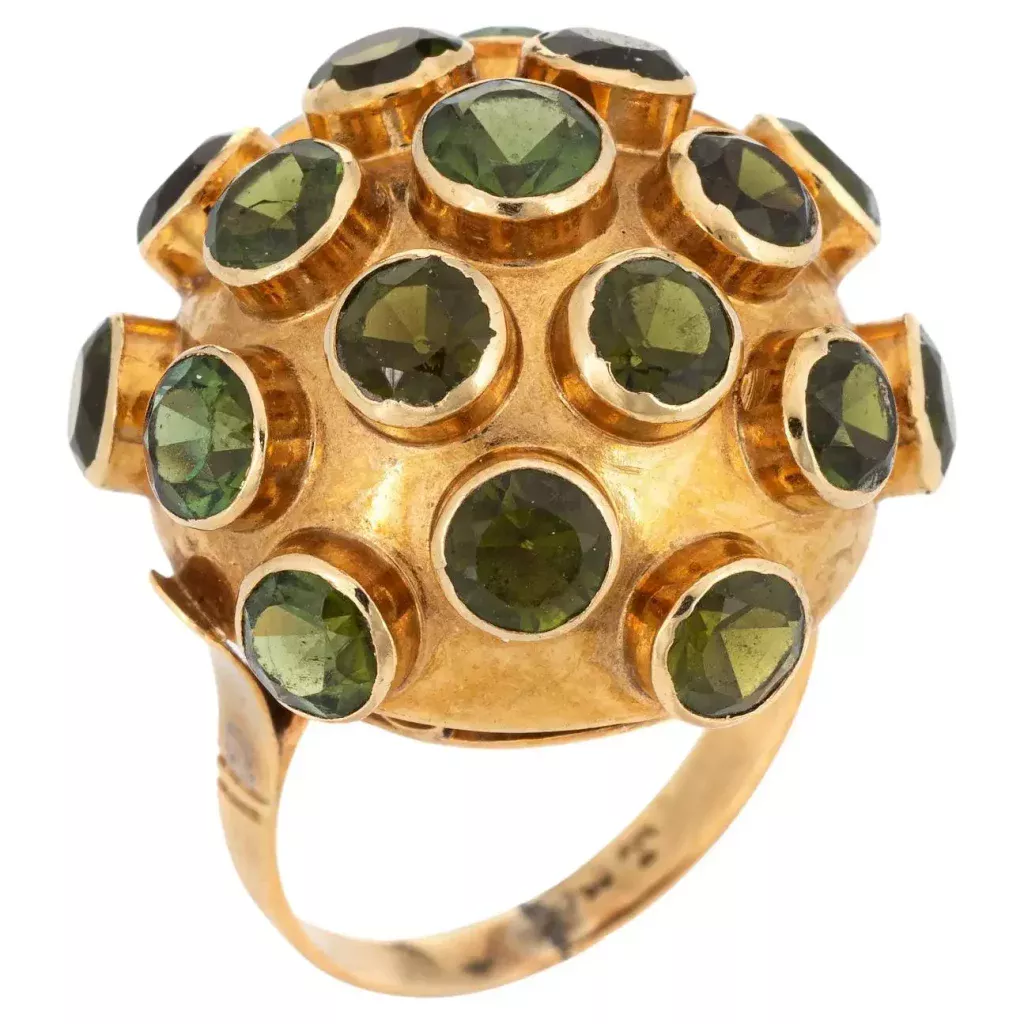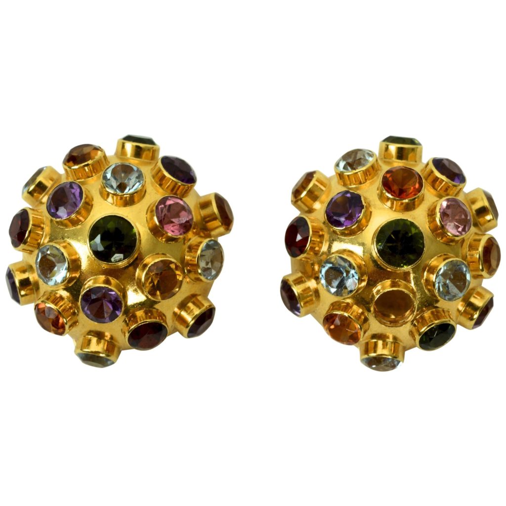 (1) Cartier sapphire brooch, late 1950. Photo: Christie’s; (2) H. Stern earrings in gold and various gemstones, 1950s-1960s. Photo: 1stdibs; (3) Gold Cartier brooch, 1960s. Photo: Miller; (4) H. Stern gold and peridot ring, 1950s-1960s. Photo: 1stdibs; (5) Cartier gold, diamond, ruby and sapphire earrings, 1960s. Photo: Christie’s; (6) Gold, diamond, ruby and sapphire brooch, unsigned, late 1950s.