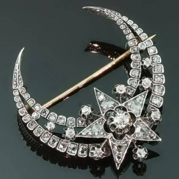 Like star jewellery, moon-shaped jewellery was also very fashionable in the second half of the 19th century. The reasons for this are more or less the same as those given in the previous paragraph on star jewellery. But in this case, in addition to the classic association between the moon and the feminine symbol, the moon has a more precise origin in the rediscovery of the Greco-Roman civilisation. Perhaps the expression “lunar triad” is not foreign to you, it symbolises the three goddesses around the moon: Selene, Hecate and Artemis in Greek (Luna, Hecate and Diana) symbolise respectively the full moon, the new or black moon and the crescent moon. They were of course highly honoured in their time and even today Wicca movements continue to celebrate Hecate, the goddess who enables communication between the earthly and the invisible. In Mesopotamia, there was Ishtar, goddess of war, love and life. The Sumerians worshipped Inanna who had similar attributions. You will find many texts on the subject if you are interested. I assure you that it is absolutely fascinating. The jewels decorated with one or more moons are therefore very symbolic jewels, turned towards the feminine and they are sometimes completed with this famous good star. The motif can be found on all types of jewellery and is often embellished with diamonds, turquoise, various gemstones but especially opals.
