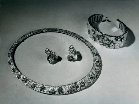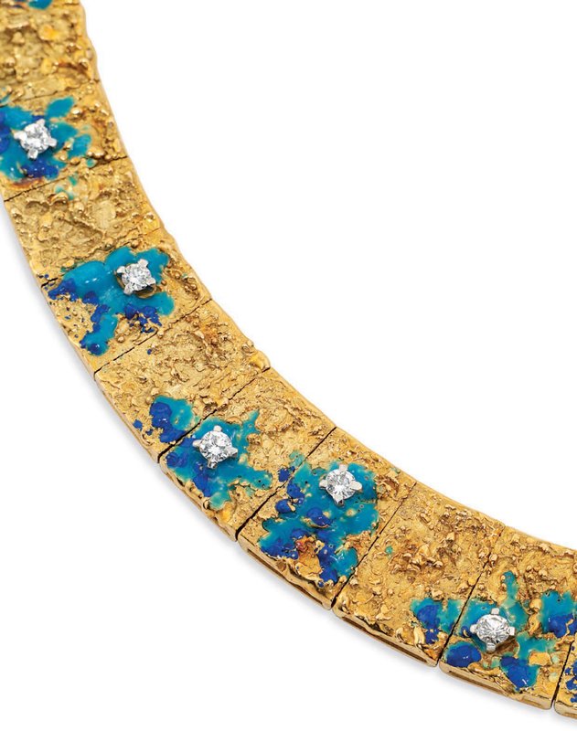 Moon Crater necklace in gold, enamel and diamonds. Sold in 2017 at Chritie’s. Designed by Roger King, made by Roy C. King Ltd for Garrard & Co. The “Moon Crater” bracelet and earrings were exhibited in the 1961 “International Exhibition of Modern Jewellery 1890-1961” at Goldsmiths Hall and the Victoria and Albert Museum. The set won 1st prize in the De Beers Modern British Jewellery Competition at Goldsmiths Hall in the same year. (1) and (2) Photos: Christie’s; (3) Photo: The Goldsmith’s Company