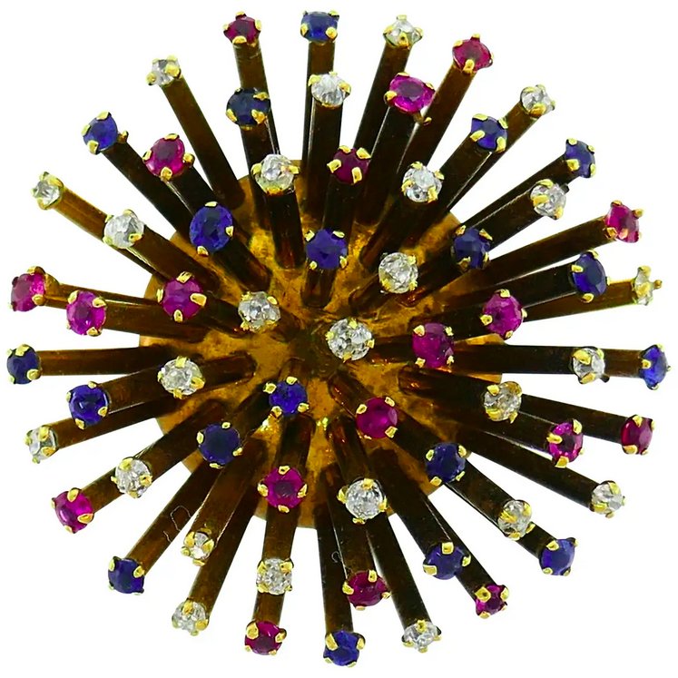 Although moons, stars and comets were still regularly used by jewellers in the early 20th century, it was not until the end of the 1950s that there was renewed interest in jewellery inspired by the sky. But these were to take a more spatial turn for a very simple reason: it was time for men to conquer space! And it starts with the successful launch of Sputnik 1, on 7 October 1957 at exactly 19:28. In doing so, the Russians inaugurated what would be called the Space Age! Sputnik” jewels were born. Of all types and sizes, they are set with numerous stones but can also be all gold. Costume jewellery was not left out and the designers of the time embraced this trend! That said, these jewels also take on the look of other satellites that will make history in space such as Luna 1 or San Marco 1 and even Asterix.
