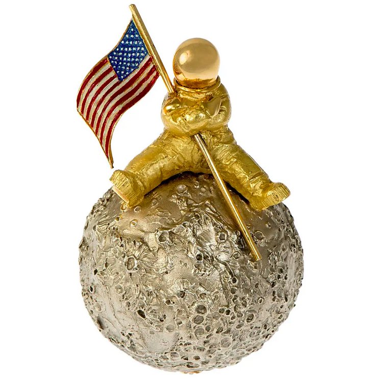 In 1958, the Americans entered the race with the successful launch of Explorer 1 and NASA was officially created on 29 July of that year. The next ten years would see a battle for control of space with mainly two countries competing in this field: the USA and Russia. Jewellery inspired by the appearance of the moon soon appeared, because since 1959, and the images provided by Luna 3, we began to know more about this satellite that is essential to life on earth. One of the first pieces of jewellery directly inspired by the appearance of the moon’s surface dates from 1961. It was made by Roy C. King Ltd.