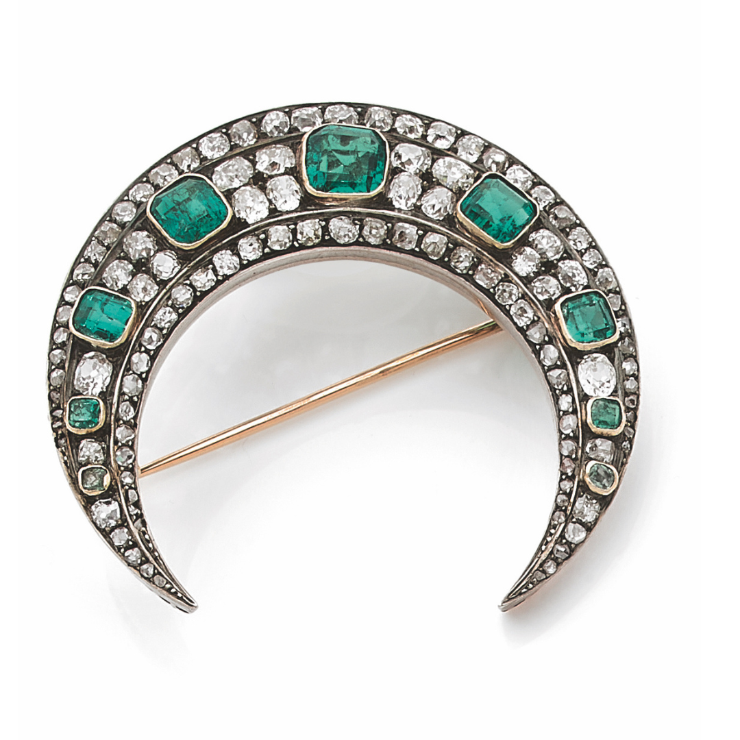 A feminine symbol par excellence, the moon in jewellery comes in all colours, to the delight of lovers of celestial jewellery. I’m definitely one of them! Perhaps you’re familiar with the expression “lunar triad”, which symbolises the three goddesses around the moon: Selene, Hecate and Artemis in Greek (Luna, Hecate and Diana) symbolise the full moon, the new moon or black moon and the crescent moon respectively. They were, of course, highly honoured in their time, and even today Wicca movements continue to celebrate Hecate, the goddess who enables communication between the earthly and the invisible. And the period is all the more interesting for being so close to the ancient festival of Samain, which celebrated the passage from the light to the shade of winter after the very last harvests. In the 19th century, this jewellery was highly symbolic and not just a fashion whim. The moon came in brooches, necklaces and even tiaras. Here in diamonds and emeralds, it was part of a set. The swan’s neck at the back and the screw system used to attach it as a pendant or perhaps to a tiara bear witness to this…