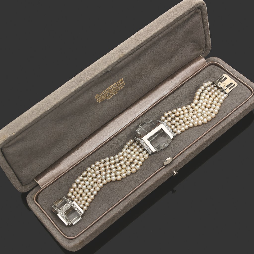 Lot 57: Boucheron gold, platinum, fine pearl, diamond and rock crystal bracelet. Estimated at between €25,000 and €30,000. Photos: Aguttes