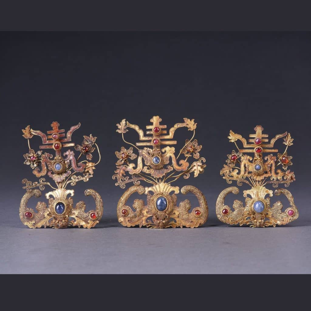 This development was accompanied by rules that defined precisely what to wear and in what circumstances. Although these rules were not necessarily followed to the letter and were subject to adaptation, the 15th and then 16th centuries saw the mass distribution of these objects. The period was a prosperous one, and the country’s wealthy elites called on imperial goldsmiths to create gold pieces embellished with gems such as rubies and spinel, imitating the practices of the Court. The most luxurious pieces generally featured a combination of stones in five colours – a reference to the theory of the “five agents” or “five elements”: wood (blue-green), fire (red), earth (yellow), metal (white) and water (black)